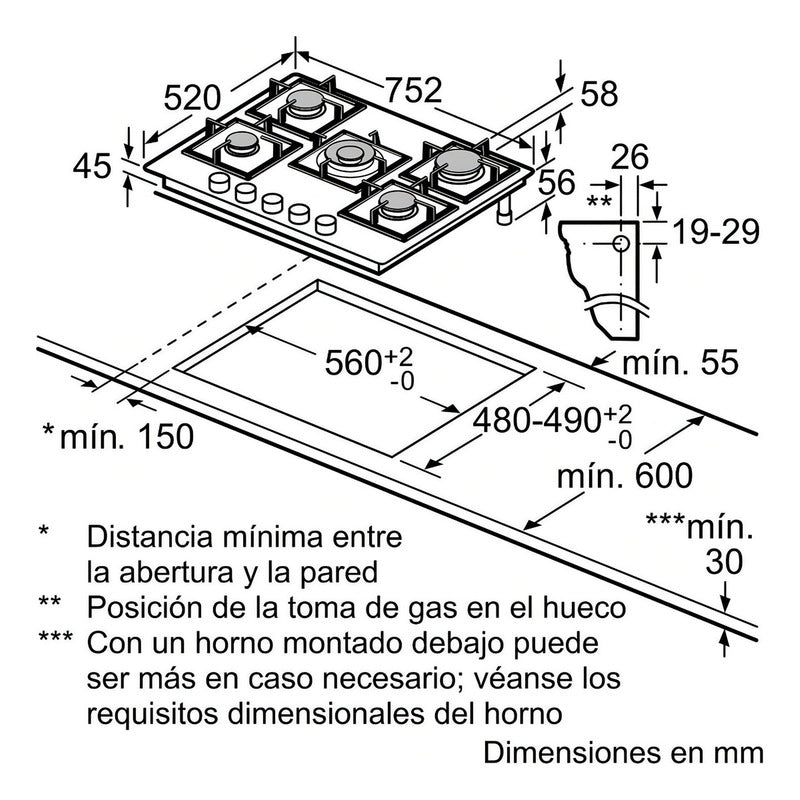 Anafe A Gas Bosch Ppq7a6b90 Vidrio 75cm 5 Hornallas Tipo de alimentación: Gas Tipo de gas: Multi gas Tipo de encendido: Electrónico Tipo de control: Perillas Tipo de instalación: Empotrable Cantidad de hornallas: 5 Ancho: 75.2 cm Profundidad: 52 cm Altura: 4.5 cm 4 quemadores de gas y 1 quemador gigante Wok de dos circuitos: - Delante derecha: quemador semi-rápido hasta 1.75 kW. - Detrás derecha: quemador rápido hasta 3 kW. - Centro: quemador Wok de 4 kW. - Delante izquierda: quemador auxiliar hasta 1 kW. - Detrás izquierda: quemador semi-rápido hasta 1.75 kW. FlameSelect: regulación precisa de la llama con 9 niveles de potencia. Mandos ergonómicos para un manejo sencillo y preciso. Sistema de seguridad Gas Stop. Autoencendido integrado en el mando. Parrillas de hierro fundido individuales. Preparada para gas natural. Inyectores opcionales para gas butano incluidos. Posibilidad de instalación sobre encimera o enrasada. Dimensiones aparato (hxaxf)(mm): 45 x 752 x 520