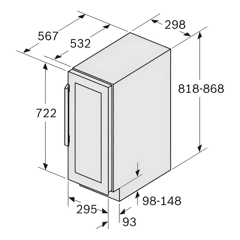 La vinoteca tiene capacidad para 21 botellas de vino, para una óptima conservación a temperatura estable. Control electrónico de temperatura, ajustable desde +5º a +20ºC, para la correcta conservación de tus vinos. Puerta de cristal con protección ultravioleta, y alarma de temperatura, para mantener los vinos en perfectas condiciones de conservación, con todo su olor y sabor. Luz LED con modo de presentación: una atractiva iluminación para tu vinoteca. - Promedio anual de consumo de energía en kilovatios hora por año (kWh/a): 100 kWh/annum - Capacidad de botellas de 75 cl: 21 - Emisiones de ruido aéreo: 38 dB(A) re 1 pW - Clase de emisiones de ruido aéreo: C - Tipo de construcción: Integrable - Opción de puerta panelable: No posible - Fondo del aparato sin tirador: 567 mm - Dimensiones de instalación necesarias (H x W x D): 820 x 300 x 550 mm - Peso neto: 26,0 kg - Potencia de conexión: 70 W - Intensidad corriente eléctrica: 6 A - Ventilador interior sección frigorífico: Si - Tensión: 220-240 V - Frecuencia: 50 Hz - Certificaciones de homologación: IRAM, CE, VDE - Longitud del cable de alimentación eléctrica: 230 cm - Nº de motocompesores: 1 - Nº de sistemas de frío independientes: 1 - Puerta reversible: Si - Interruptor luz interior: No - Iluminación de presentación: Sí - Iluminación on/off: Sí - Alarma óptica y acústica de puerta abierta - Alarma de temperatura, para mantener los vinos en perfectas condiciones de conservación - Puerta reversible - Puerta 3 cristales con Filtro UV - Panel de mando electrónico para control de todas las funciones - Dimensiones de encastre (alto x ancho x fondo): 82 x 30 x 55 cm - Dimensiones del aparato (alto x ancho x fondo sin tirador): 81.8 x 29.8 x 56.7 cm - Dimensiones con embalaje (alto x ancho x profundidad) 90x34x68 cm