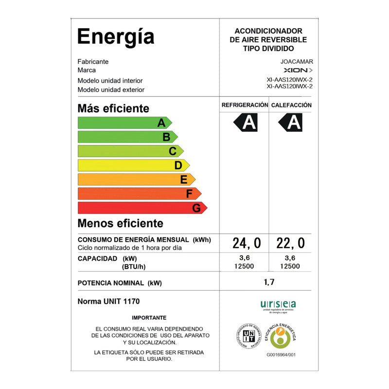 AIRE ACONDICIONADO XION INVERTER 12000 BTU CON WIFI COLOR GRIS Frío/Calor Control remoto Voltaje 220-240V Frecuencia 50 Hz Gas refrigerante: R410A Eficiencia energética A