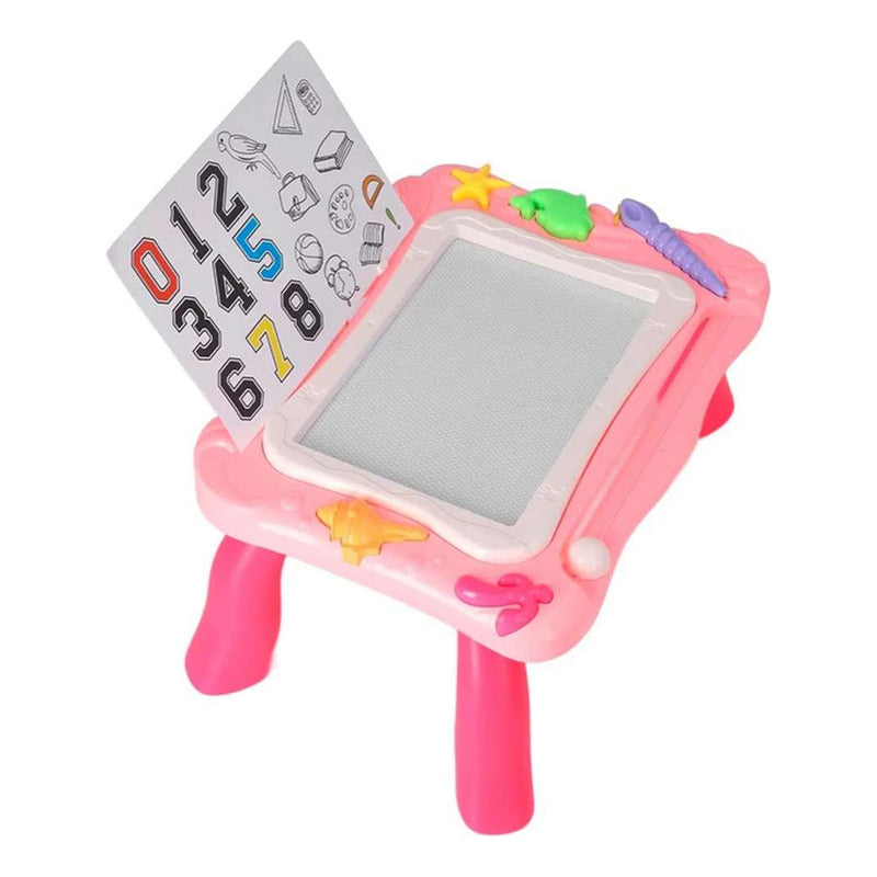 Encantadora mesa de tablero de dibujo magnético en un divertido color rosa, equipada con 4 áreas de distintos colores: rojo, azul, verde y amarillo para dar rienda suelta a la creatividad. Fabricada en resistente material plástico con bordes redondeados para mayor seguridad, este tablero incluye un borrador magnético en la parte inferior para comenzar de cero todas las veces que quieras. Se dibuja con un lápiz de precisión que viene con una cuerdita ajustada al tablero. Con cuatro patas encastrables que permiten utilizarlo como mesa, este tablero también cuenta con encantadoras piezas laterales con formas del mar y colores vibrantes, junto a un compartimento desmontable para apoyar hojas y crear los dibujos más impresionantes. Características: Dimensiones: 32.5 x 25 x 16.5 cm. Material: Plástico. Color: Rosado. Incluye: 4 patas, lápiz, 2 piezas removibles con formas de colores, hoja con números de colores y formas para calcar.