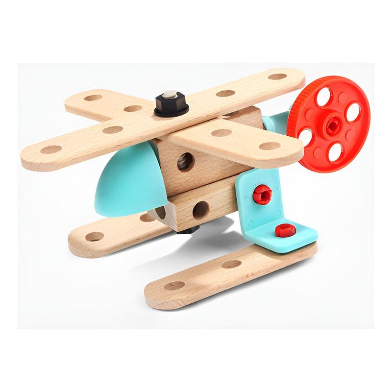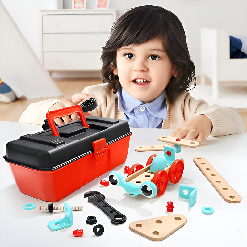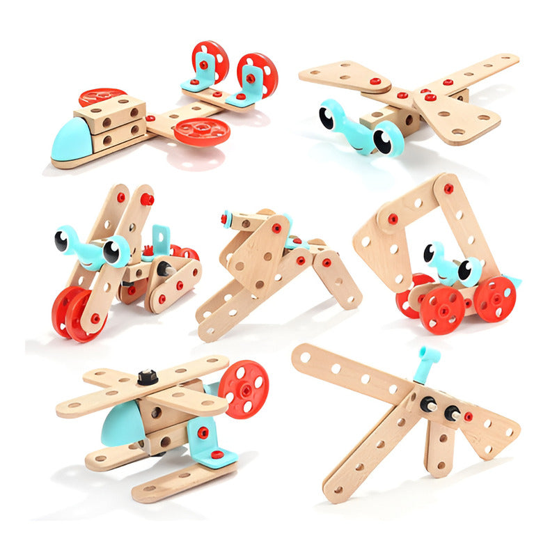 Componentes del juguete: Piezas de madera,herramientas de plástico,Ruedas,tornillos,tuercas