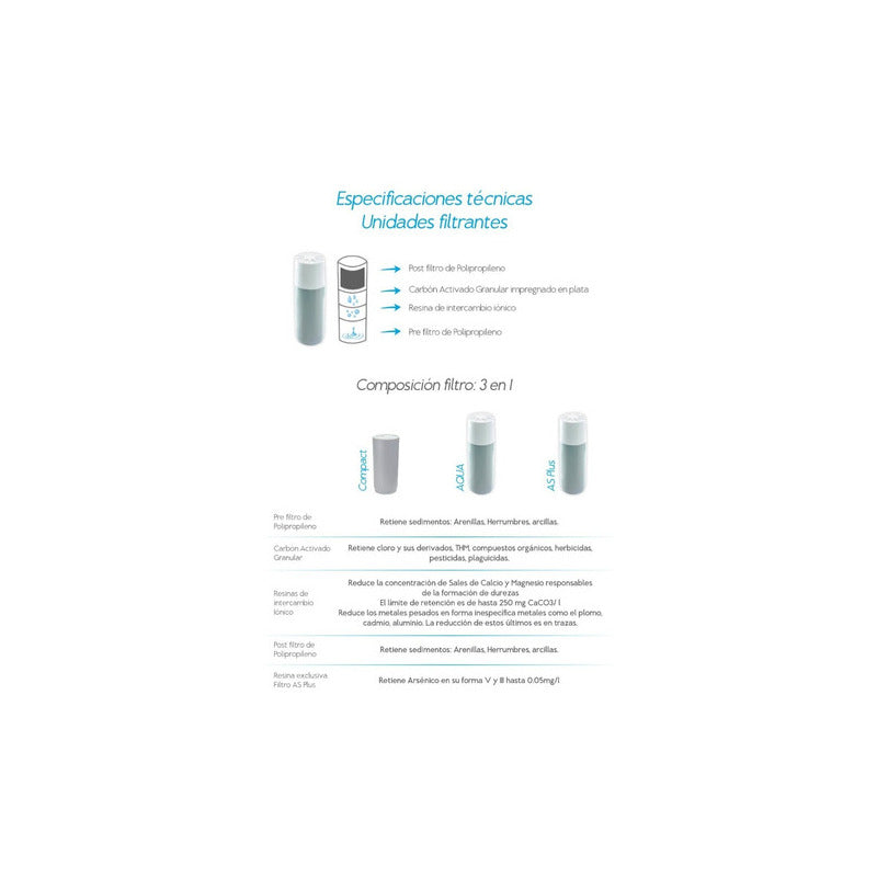 Sustancias eliminadas: Cloraminas,Cloro,Herrumbres,Metales,Metales pesados,Orgánicos,Pesticidas,Plaguicidas,Químicos,Sedimentos,Trihalometanos,Óxido