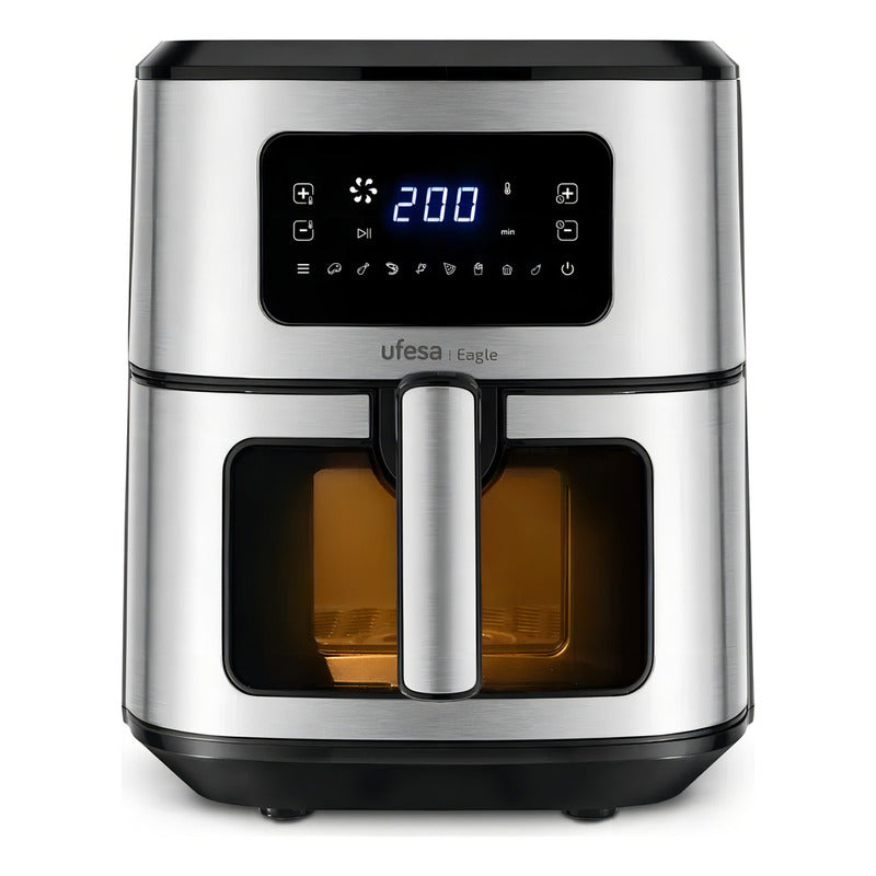 UFESA Freidora Sin Aceite AirFryer Eagle Marca: Ufesa Código: C015506 Potencia 1700W. Capacidad total: 6.5Lts. Cubeta y bandeja antiadherentes. Cubeta con ventana y luz interior. 8 programas preestablecidos: hornear, papas fritas, pescado, camarones, verduras, pizza, carne y pollo. Control táctil digital de tiempo y temperatura. Temporizador de hasta 60 minutos. Control de temperatura hasta 200°C. Tecnología 360° de circulación de aire a alta velocidad. Pies antideslizantes. Cuerpo y asa de tacto frío.