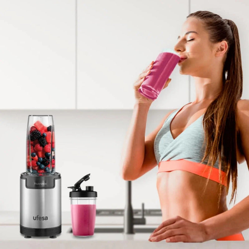 Licuadora personal Ufesa Nutrimix • Potencia: 900 W. • Cuchillas extractoras de alta eficiencia. • Tritura las semillas, la piel y los tallos. • Fácil desmontaje para limpiar. • Tritura fruta congelada y hielo tipo cóctel. • Accesorios incluidos: tapa Sip & Seal, cuchilla de batir, cuchilla de moler, tapa del vaso de sellado, jarra de 0,5 l, jarra de 0,8 l.