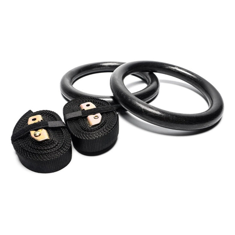Ofrecen un agarre firme y cómodo, además de ser menos susceptibles a la humedad o cambios ambientales. Son una opción popular para entrenamientos en interiores y exteriores, manteniendo la calidad y el rendimiento. Se emplean para realizar ejercicios de fuerza, equilibrio y control corporal, siendo versátiles y desafiantes para el desarrollo muscular y la habilidad atlética. Incluyen: 2 anillas circulares hechas de madera resistente y duradera de 23 cm de diámetro y 2.8 cm de espesor 2 correas ajustables de 4.5 m Material compuesto de resina plástica resistente.