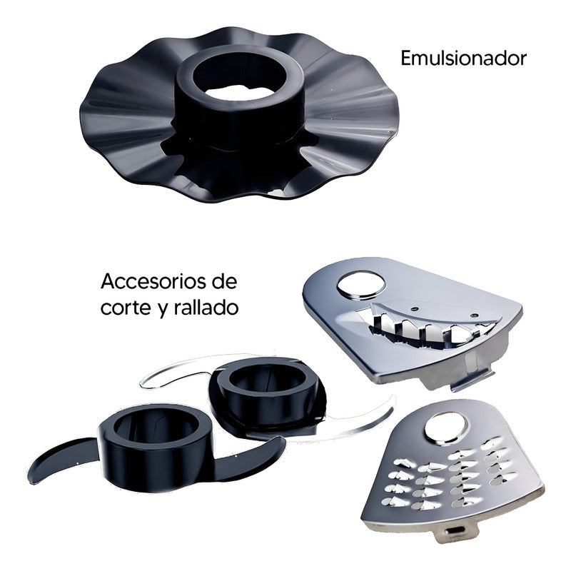 Accesorios incluidos: 1 cuchilla,1 cuerpo exprimidor,1 disco batidor emulsionador,1 disco cortador,1 disco corte juliana,1 disco para papas fritas,1 empujador,1 exprimidor